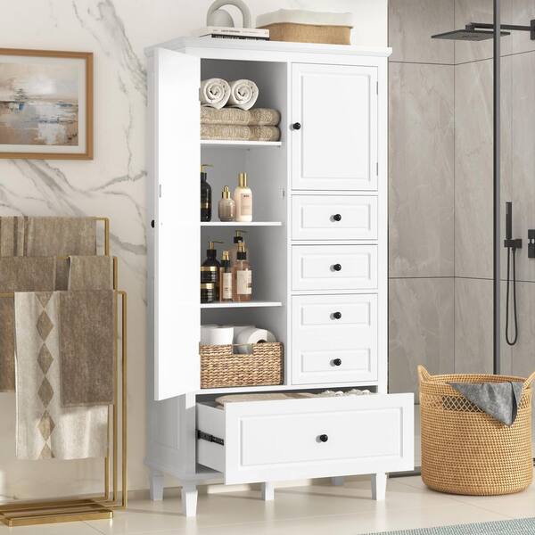 30 in. W x 15 in. D x 61 in. H White Wood Freestanding Bathroom Linen Cabinet with 4 Drawers and Adjustable Shelves