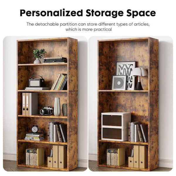 5-Shelf Brown Freestanding MDF Open Bookcase, Pantry Display Storage Shelves for Kitchen, Living Room, Office, Bedroom