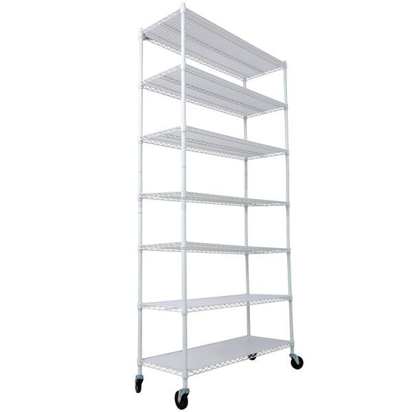 7-Tier Metal Shelf, 2450 lbs. Heavy Duty Adjustable Storage Rack with Wheels and Shelf Liners for Kitchen, Garage-White