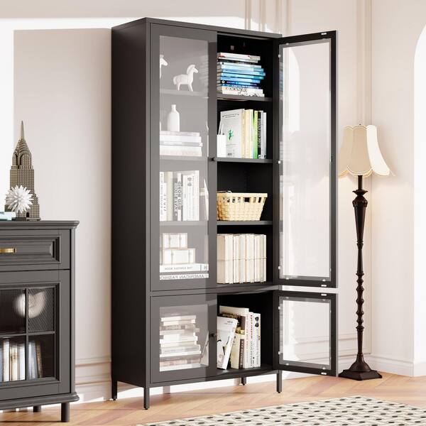 71 in. Tall Black Steel Kitchen Storage Cabient, Modern Freestanding Bookcase with 4-Tempered Glass Doors and 5-Shelves