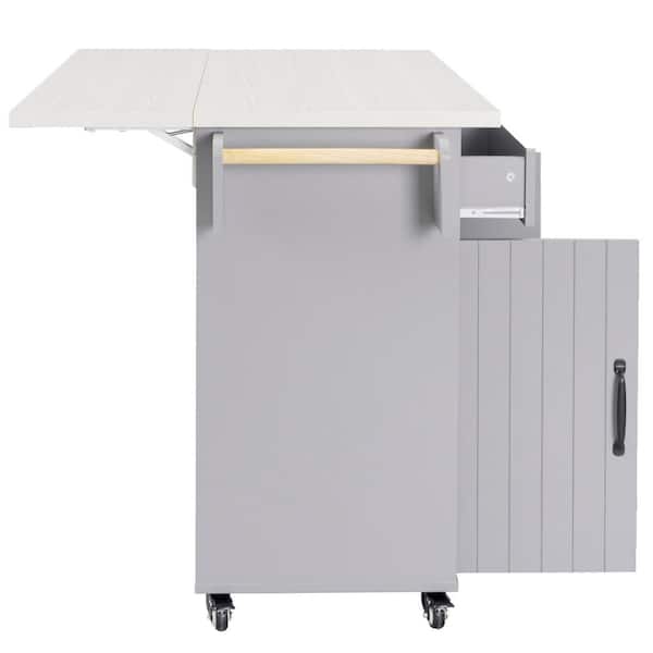 Grey Wood 44 in. Kitchen Island Cart with Drop Leaf, Trash Can Storage Cabinet, Adjustable Shelf and Removable Wheels
