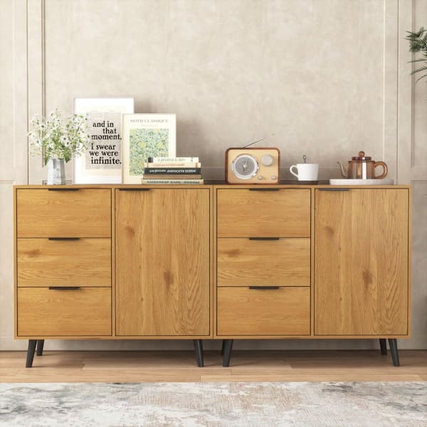 Kitchen Pantry, Storage Cabinet with 3 Drawers and Adjustable Shelf, Mid Century Cabinet with Door in Natural