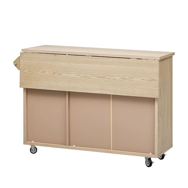 Natural MDF 51.2 in. Ash Veneer Kitchen Island on Wheels with Drop Leaf, 3 Doors and Adjustable Shleves