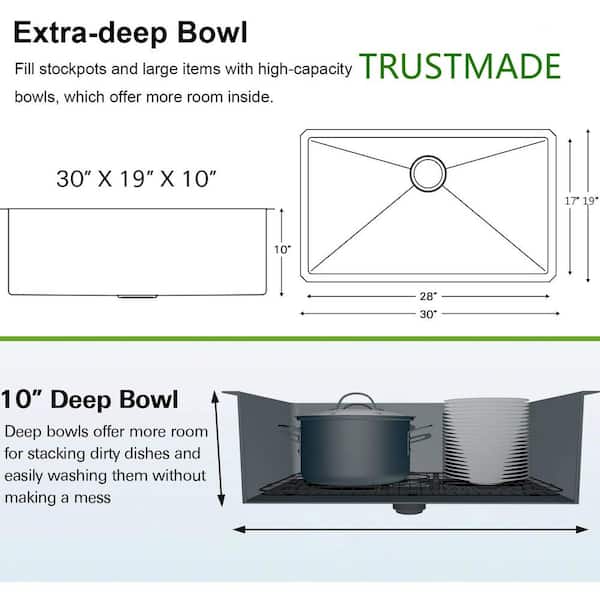 • 30 in. single bowl, 10 in. deep with R10 corners