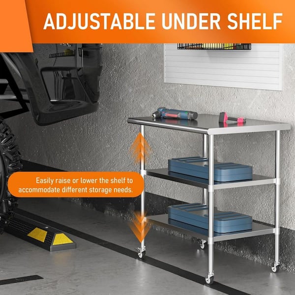 Stainless Steel Table with Wheel Caster, Metal Food Prep Work Table with 2 Adjustable Undershelves for Kitchen-Silver