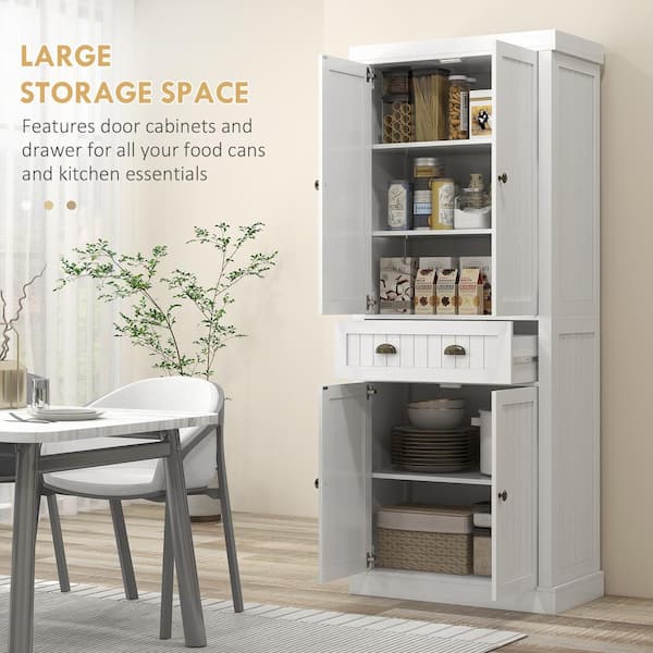 White Freestanding Kitchen Pantry Cabinet with 4 Soft-Close Doors, 2 Adjustable Shelves and Drawer for Dining Room
