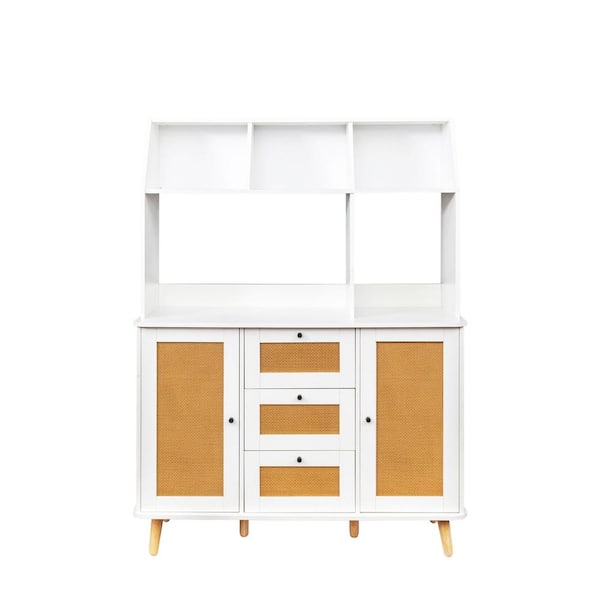 White MDF Pantry Organizer with Rattan Door and 3-Drawers, Floor Cabinet Storage, Buffet Cabinet