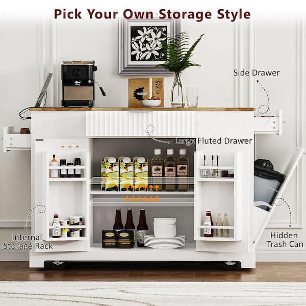 White Wood 48.5 in. Kitchen Island with Trash Can Storage Cabinet, Power Outlet, 3 Drawers and Open Side Racks
