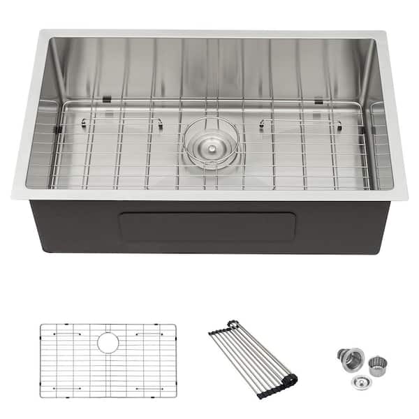 32 in. Undermount Single Bowl 16 Gauge Brushed Nickel Stainless Steel Kitchen Sink with Bottom Grids