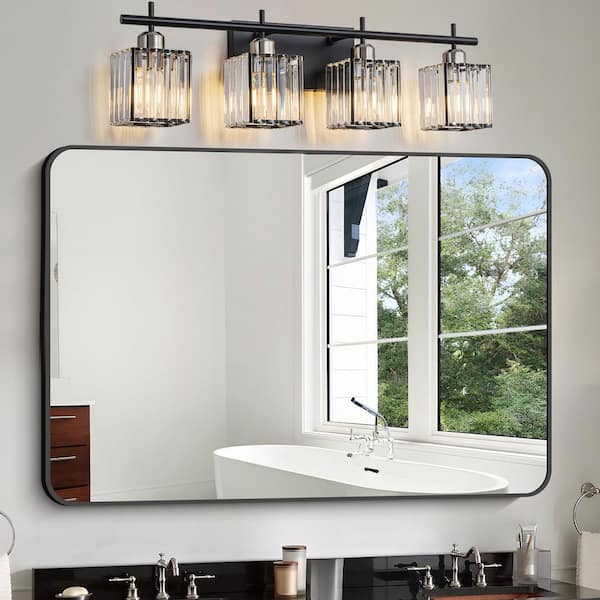 28 in. 4-Light Matte Black and Brushed Nickel Crystal Vanity Light, Modern Wall Mount Bathroom Light Fixture Over Mirror