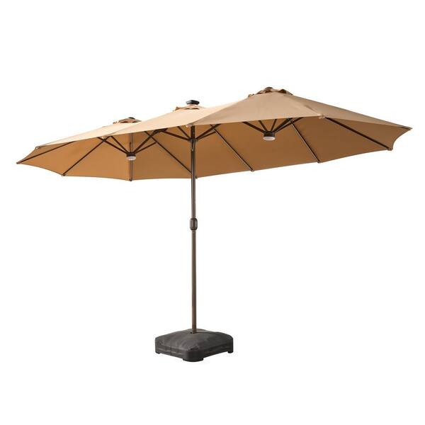 15 ft. x 9 ft. Metal Solar LED Lights Double-sided Market Patio Umbrella with Base and Crank in Khaki