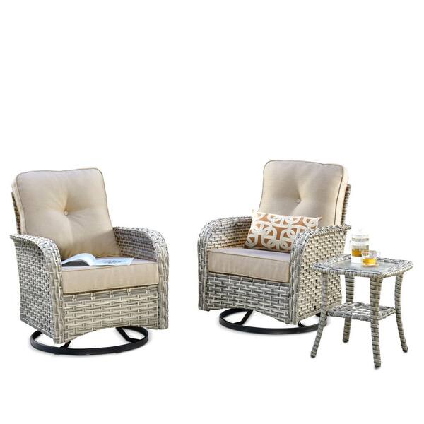 Beverly Gray 3-Piece Wicker Outdoor Patio Conversation Swivel Rocking Chair Seating Set with Beige Cushions