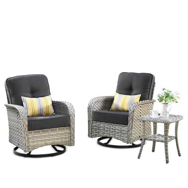 Beverly Gray 3-Piece Wicker Outdoor Patio Conversation Swivel Rocking Chair Seating Set with Black Cushions