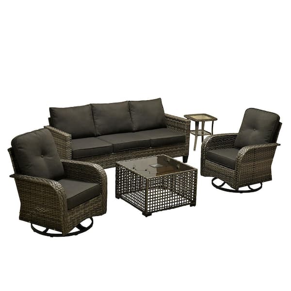 Daphne 5-Piece Wicker Patio Conversation Sofa Seating Set with Swivel Rocking Chairs and Black Cushions