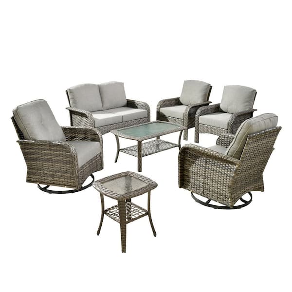 Denali Gray 7-Piece Modern Wicker Patio Conversation Sofa Seating Swivel Rocking Chairs Set with Dark Gray Cushions