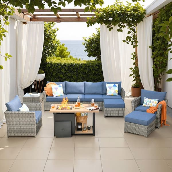 Eufaula Gray 10-Piece Wicker Modern Outdoor Patio Conversation Sofa Set with a Storage Fire Pit and Denim Blue Cushions