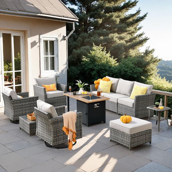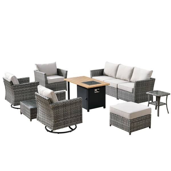 Eufaula Gray 10-Piece Wicker Outdoor Patio Conversation Sofa Set with a Storage Shelf Fire Pit and Coarse Beige Cushions