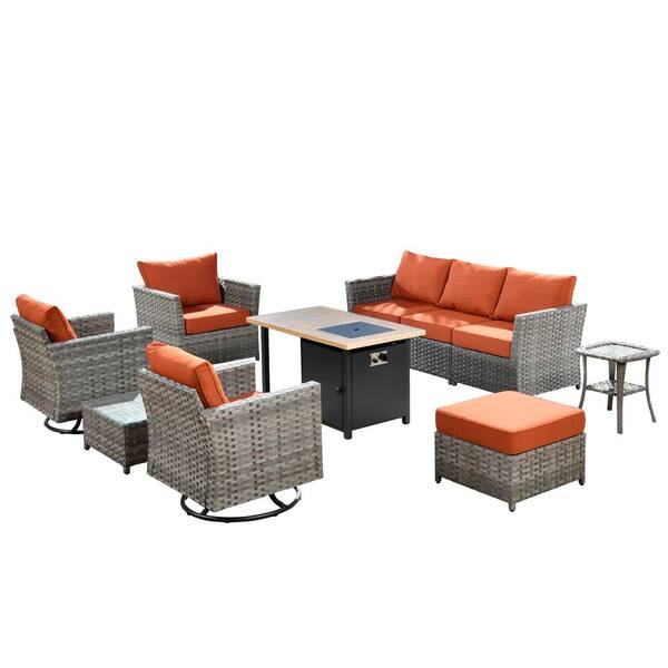 Eufaula Gray 10-Piece Wicker Outdoor Patio Conversation Sofa Set with a Storage Shelf Fire Pit and Orange Red Cushions