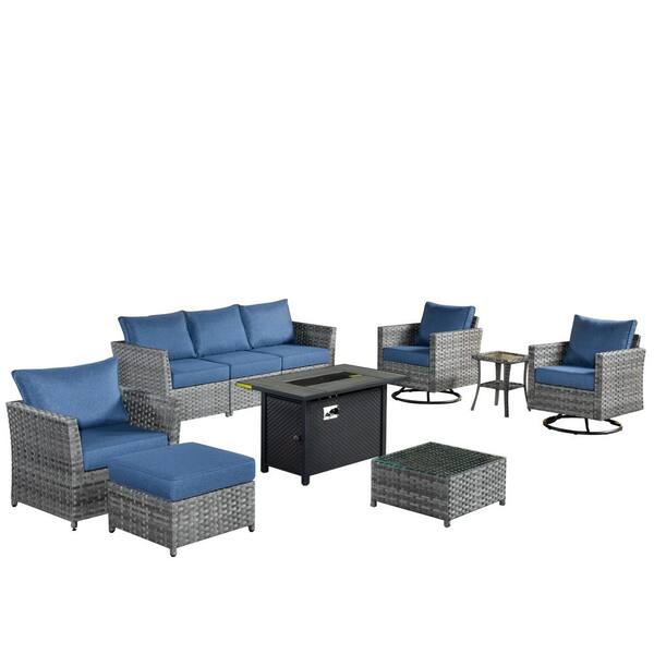 Eufaula Gray 10-Piece Wicker Patio Fire Pit Conversation Sofa Set with Swivel Rocking Chairs and Denim Blue Cushions