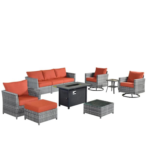 Eufaula Gray 10-Piece Wicker Patio Fire Pit Conversation Sofa Set with Swivel Rocking Chairs and Orange Red Cushions
