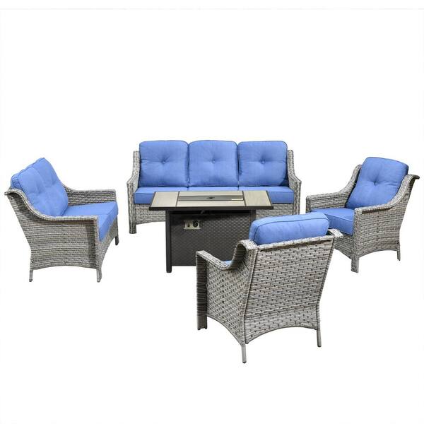 Eureka 5-Piece Modern Wicker Outdoor Patio Conversation Sofa Seating Set with Metal Fire Pit and Blue Cushions