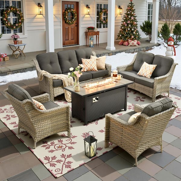 Eureka 5-Piece Wicker Outdoor Fire Pit Patio Conversation Sofa Seating Set with Black Cushions