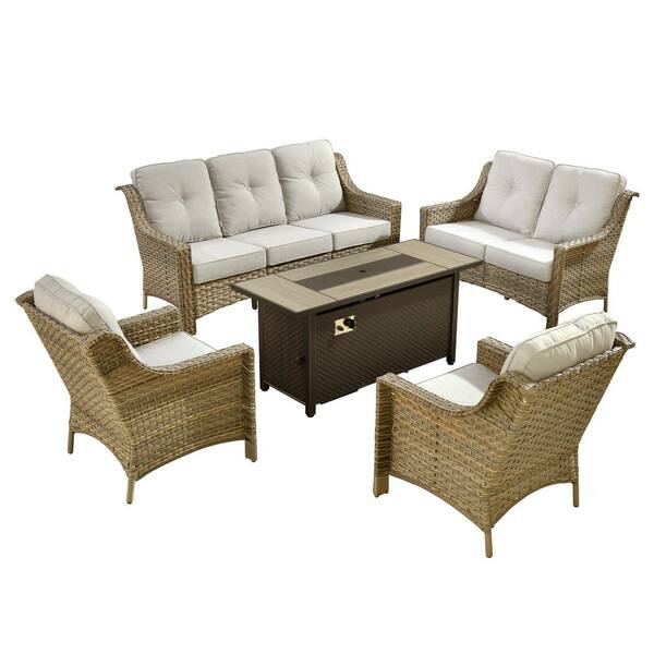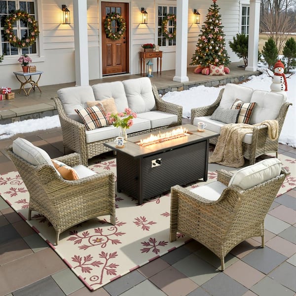 Eureka 5-Piece Wicker Outdoor Fire Pit Patio Conversation Sofa Seating Set with Light Gray Cushions