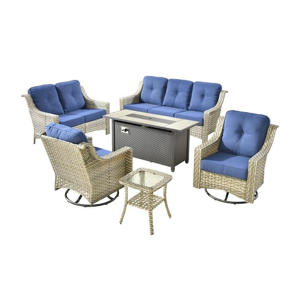 Eureka 6-Piece Wicker Patio Conversation Sofa Seating Set with Metal Fire Pit Table and Navy Blue Cushions
