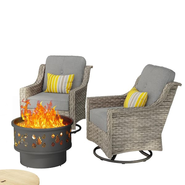 Eureka Gray 3-Piece Wicker Patio Conversation Swivel Chair Set with a Wood-Burning Fire Pit and Dark Gray Cushions