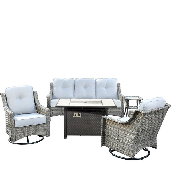 Eureka Gray 5-Piece Wicker Outdoor Patio Conversation Sofa Chair Seating Set with Metal Fire Pit and Light Gray Cushions