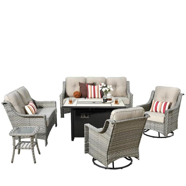 Eureka Gray 6-Piece Wicker Outdoor Patio Conversation Sofa Loveseat Set with a Metal Fire Pit and Beige Cushions