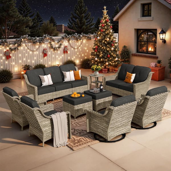 Eureka Gray 9-Piece Wicker Modern Outdoor Patio Conversation Sofa Seating Set with Swivel Chairs and Black Cushions