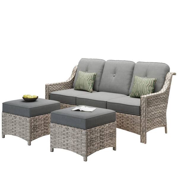 Eureka Grey 3-Piece Modern Wicker Outdoor Patio Conversation Sofa Seating Set with Dark Grey Cushions