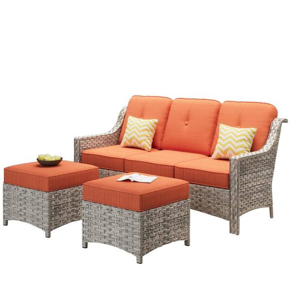 Eureka Grey 3-Piece Modern Wicker Outdoor Patio Conversation Sofa Seating Set with Orange Red Cushions
