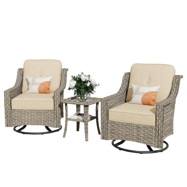 Eureka Grey 3-Piece Wicker Outdoor Patio Conversation Swivel Rocking Chair Seating Set with Beige Cushions