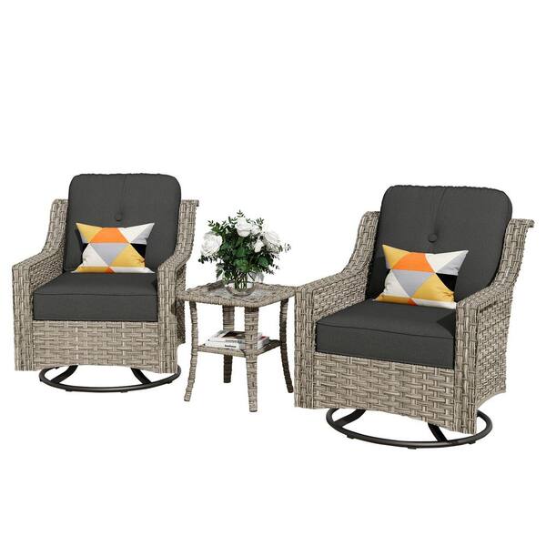 Eureka Grey 3-Piece Wicker Outdoor Patio Conversation Swivel Rocking Chair Seating Set with Black Cushions