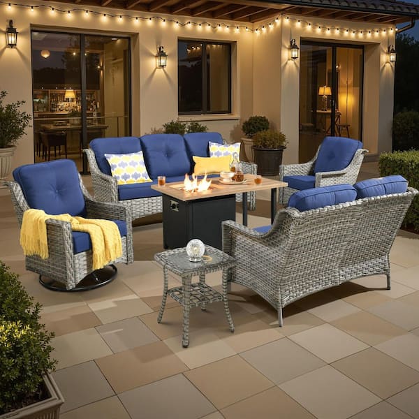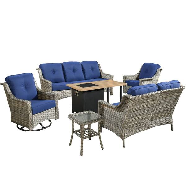 Eureka Grey 6-Piece Wicker Outdoor Patio Conversation Sofa Loveseat Set with a Storage Fire Pit and Navy Blue Cushions