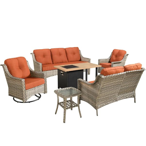 Eureka Grey 6-Piece Wicker Outdoor Patio Conversation Sofa Loveseat Set with a Storage Fire Pit and Orange Red Cushions