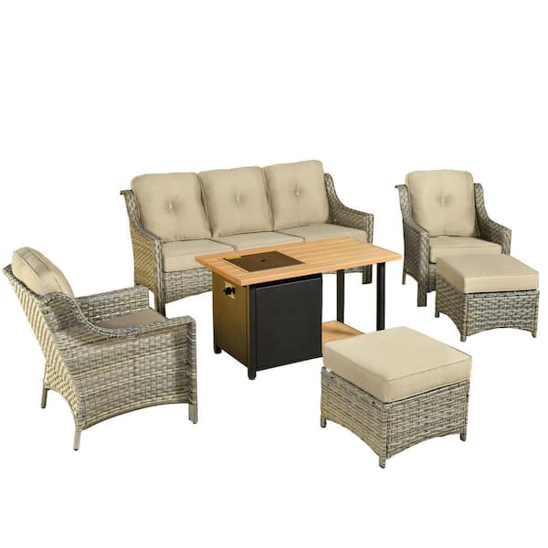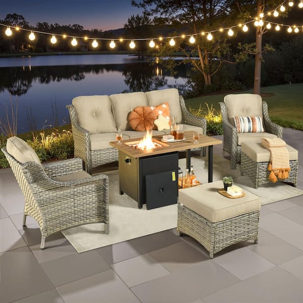 Eureka Grey 6-Piece Wicker Outdoor Patio Conversation Sofa Seating Set with a Storage Fire Pit and Beige Cushions