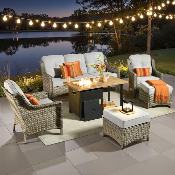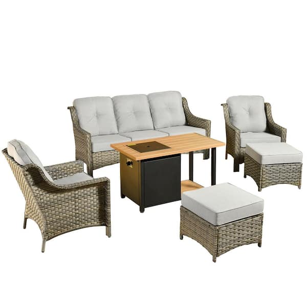 Eureka Grey 6-Piece Wicker Outdoor Patio Conversation Sofa Seating Set with a Storage Fire Pit and Light Gray Cushions