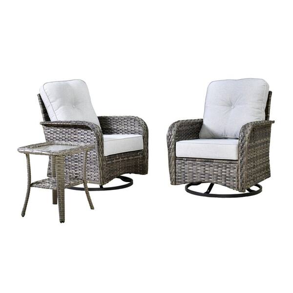 Galene Gray 3-Piece Wicker Outdoor Patio Conversation Swivel Rocking Chair Seating Set with Light Gray Cushions