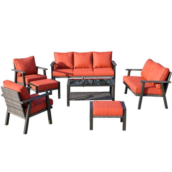 Geneva Grey 7-Piece 7-Seat Wicker Metal Outdoor Patio Conversation Sofa Seating Set with Orange Red Cushions