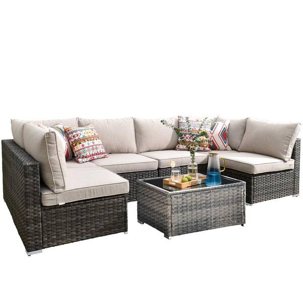 Maire Gray 7-Piece Wicker Outdoor Patio Conversation Sofa Seating Set with Beige Cushions