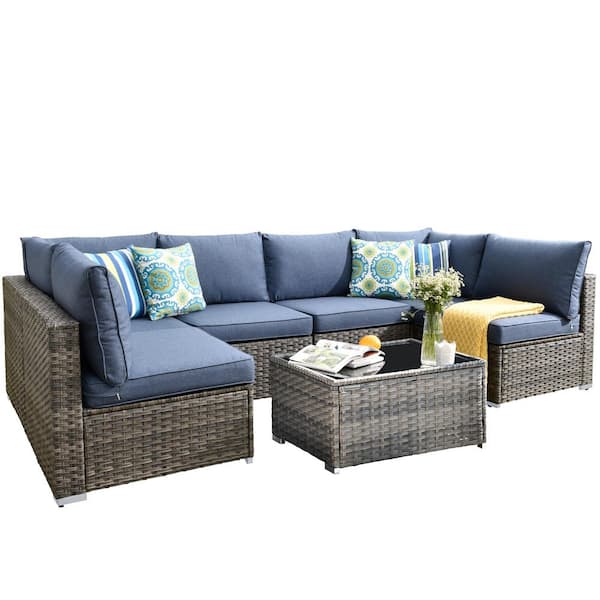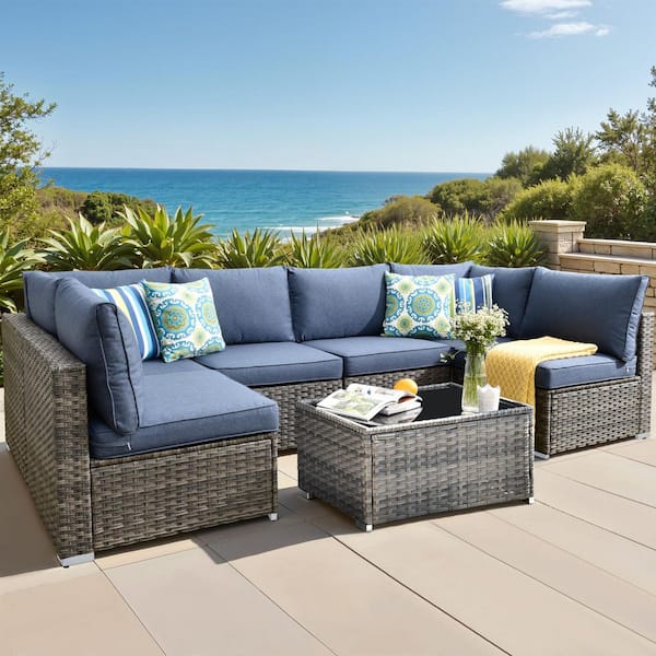 Maire Gray 7-Piece Wicker Outdoor Patio Conversation Sofa Seating Set with Denim Blue Cushions