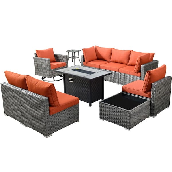 Sanibel Gray 10-Piece Wicker Patio Conversation Sofa Set with a Swivel Chair, a Metal Fire Pit and Orange Red Cushions