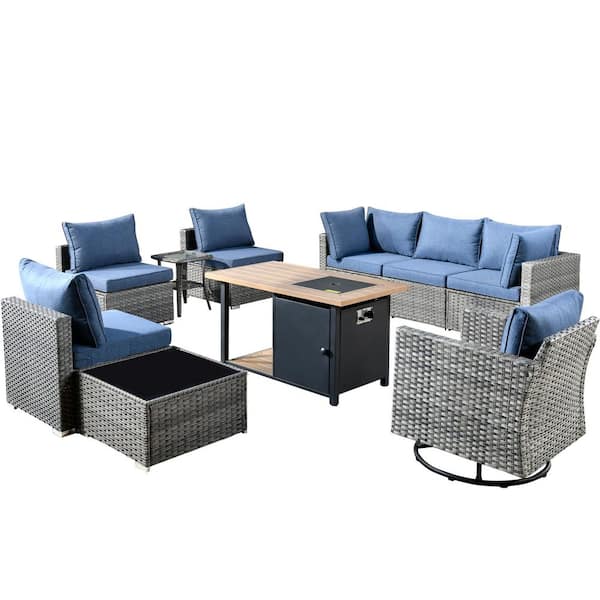 Sanibel Gray 10-Piece Wicker Patio Conversation Sofa Set with a Swivel Chair, a Storage Fire Pit and Denim Blue Cushions