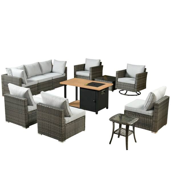 Sanibel Gray 11-Piece Wicker Outdoor Patio Conversation Sofa Set with a Storage Fire Pit and Light Gray Cushions