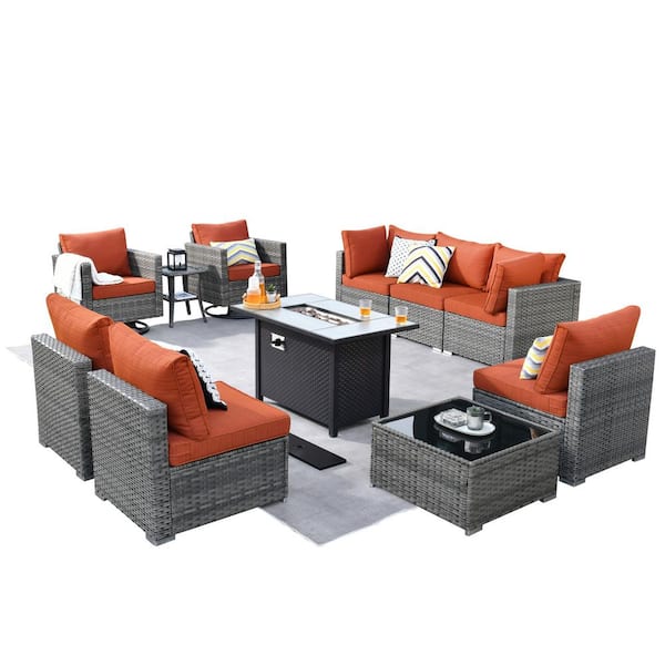 Sanibel Gray 11-Piece Wicker Patio Conversation Fire Pit Sectional Sofa Set with Swivel Chairs and Orange Red Cushions