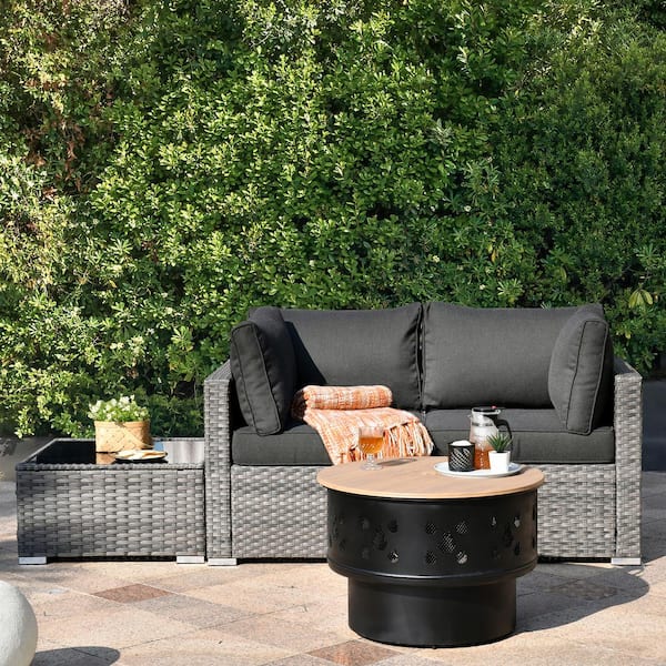 Sanibel Gray 4-Piece Wicker Outdoor Patio Conversation Sofa Set with a Wood-Burning Fire Pit and Black Cushions