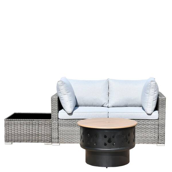 Sanibel Gray 4-Piece Wicker Outdoor Patio Conversation Sofa Set with a Wood-Burning Fire Pit and Light Gray Cushions